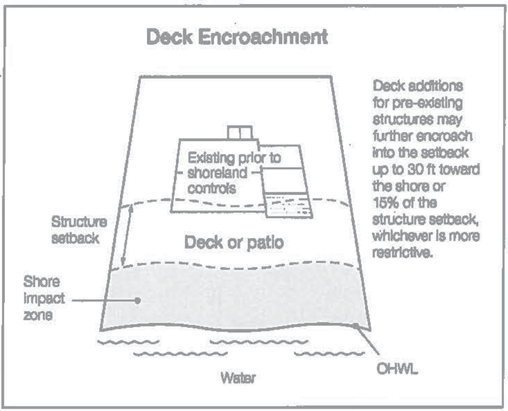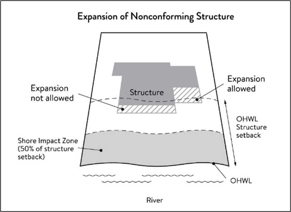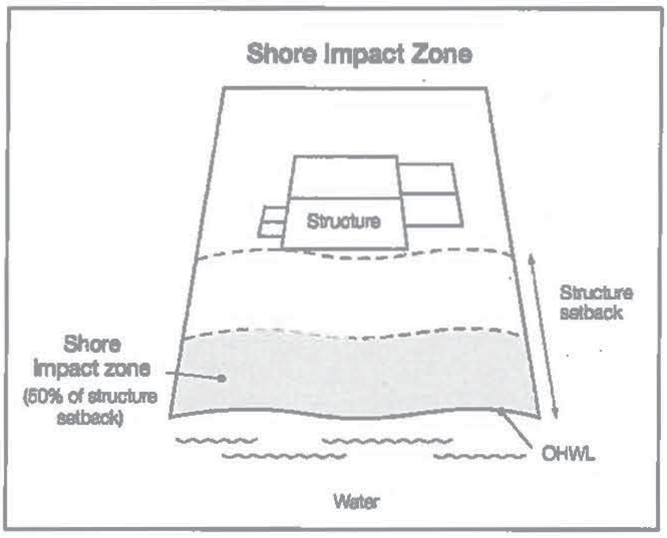 Shore impact zone: Land located between the ordinary high-water level of a public water and a line parallel to it at a setback of 50 percent of the structure setback.