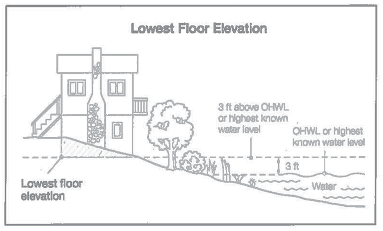 Ordinary high-water level: The boundary of public waters and wetlands and shall be an elevation delineating the highest water level which has been maintained for a sufficient period of time to leave evidence upon the landscape, commonly that point where the natural vegetation changes from predominantly aquatic to predominantly terrestrial. For watercourses, the ordinary high-water level is the elevation of the top of the bank of the channel. For reservoirs and flowages, the ordinary high-water level is the operating elevation of the normal summer pool.