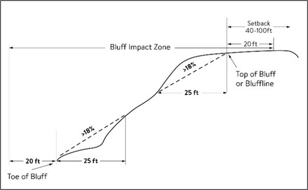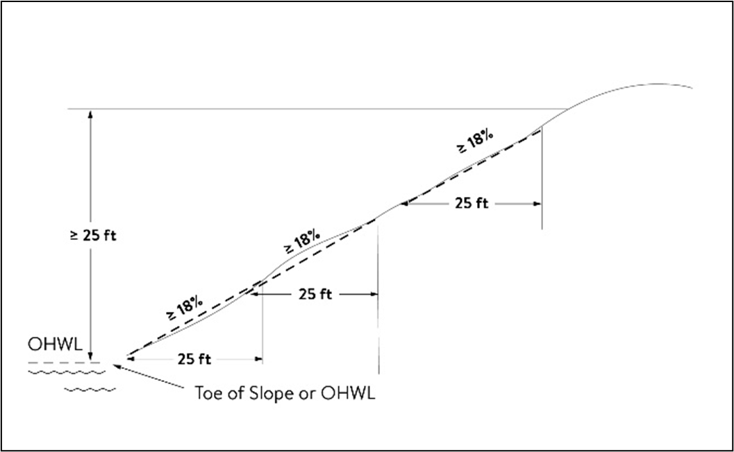 Bluff, toe of: The lower point of a 50-foot segment with an average slope exceeding 18 percent or the ordinary high-water level, whichever is higher.
