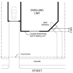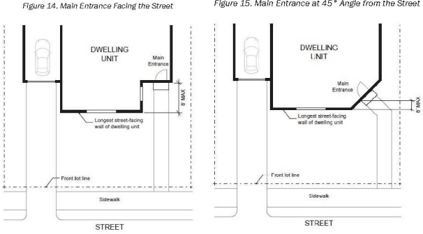 Be at an angle of up to 45 degrees from the street (see Figure 15);