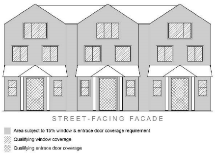 Windows. A minimum of 15 percent of the area of all street-facing facades on each individual unit must include windows or entrance doors. Half of the window area in the door of an attached garage may count toward meeting this standard. See Figure 18.