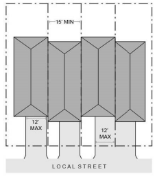 Garages on the front façade of a townhouse, off-street parking areas in the front yard, and driveways in front of a townhouse are prohibited unless the following standards are met (see Figure 24). For the purposes of this section, "driveway approach" means the edge of a driveway where it abuts a public right-of-way.