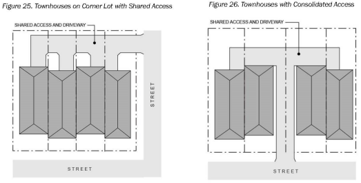 A townhouse project that includes a corner lot shall take access from a single driveway approach on the side of the corner lot. See Figure 25; and