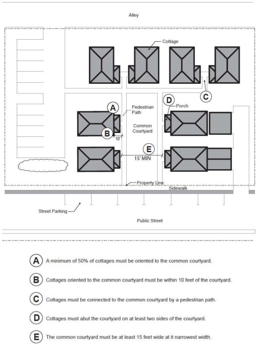 Cottage Orientation. Cottages must be clustered around a common courtyard and must meet the following standards (see Figure 27):