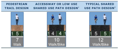 1 For short segments, a low use shared use path can be as narrow as 8-feet wide, with a 1-foot shoulder on each side and a total right-of-way of 10 feet.