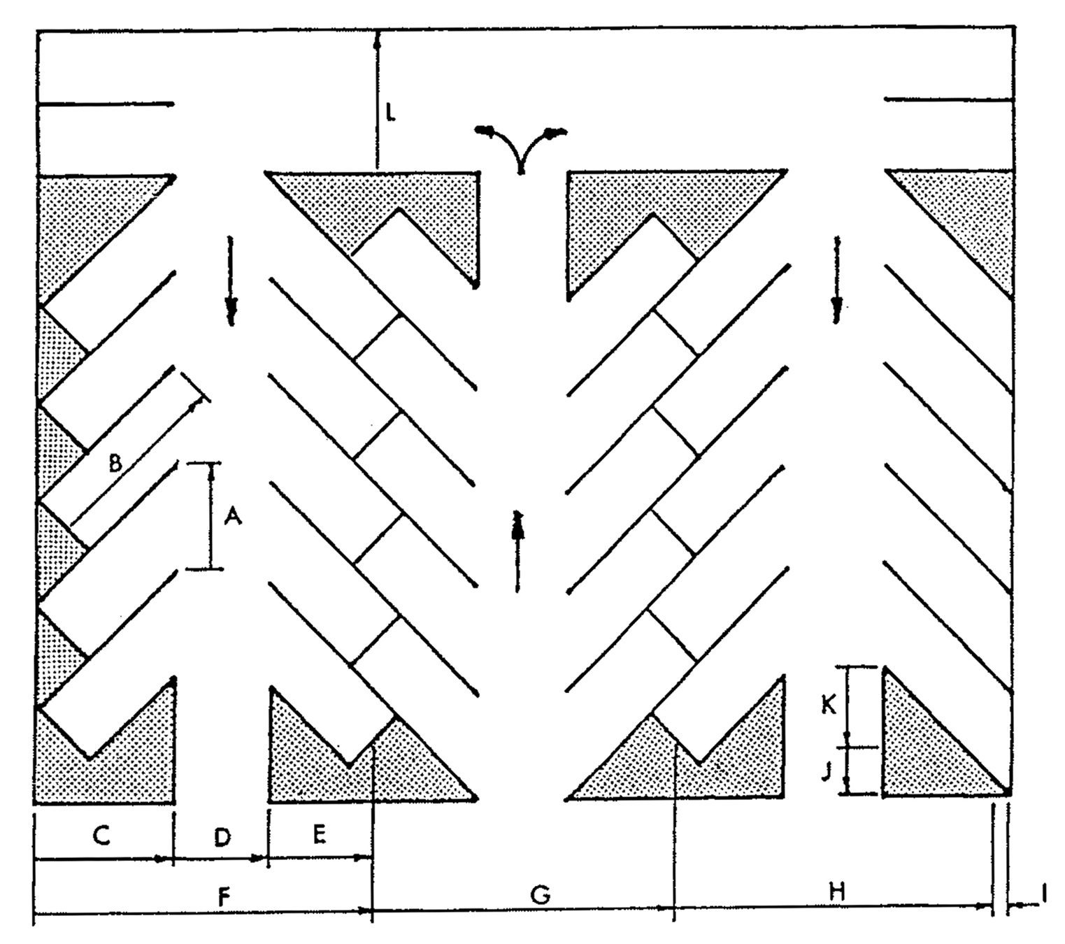 The parking layout dimensions (in feet) for eight-foot compact parking stalls at various angles are shown in Table 9-3.