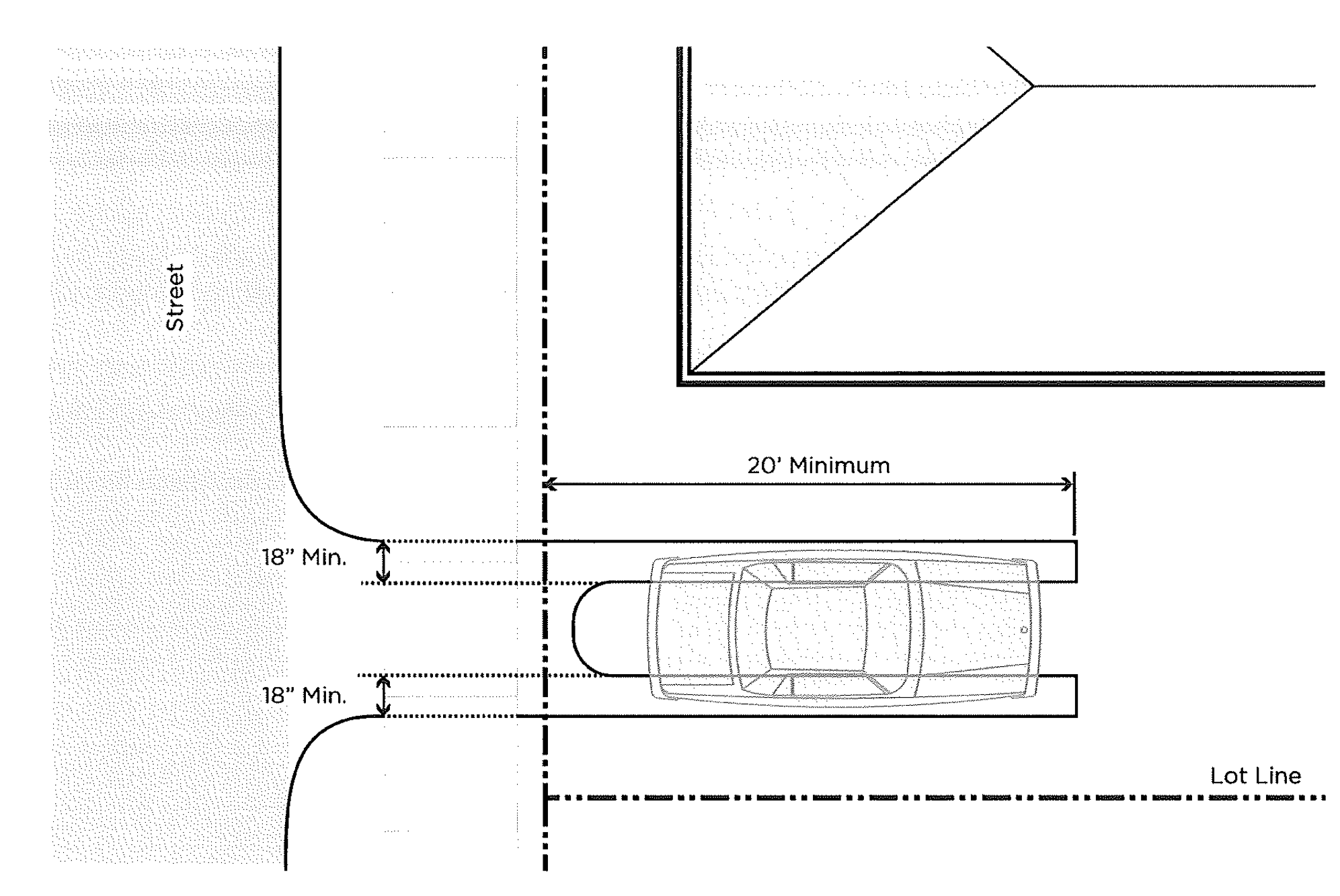 For single-family and two-family dwellings, a driveway may consist of two parallel paved strips, each of which is at least 18 inches in width and 18 feet long. Gravel and wood chips are prohibited as fill material between the strips.