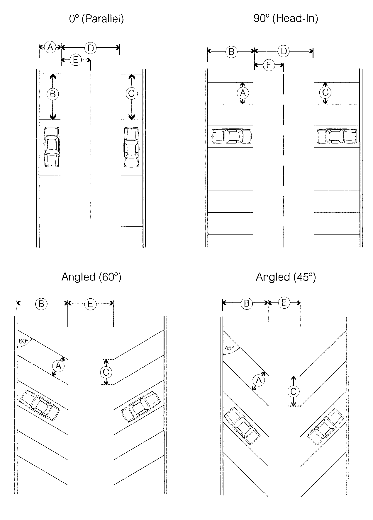Off-street parking spaces and drive aisles within a parking lot or structure must be designed in accordance with Table 10-1: Off-Street Parking Space Dimensions. Additional parking angles other than those described in Table 10-1 are permitted but a site plan is required to provide evidence of safe and efficient parking configuration and traffic circulation.