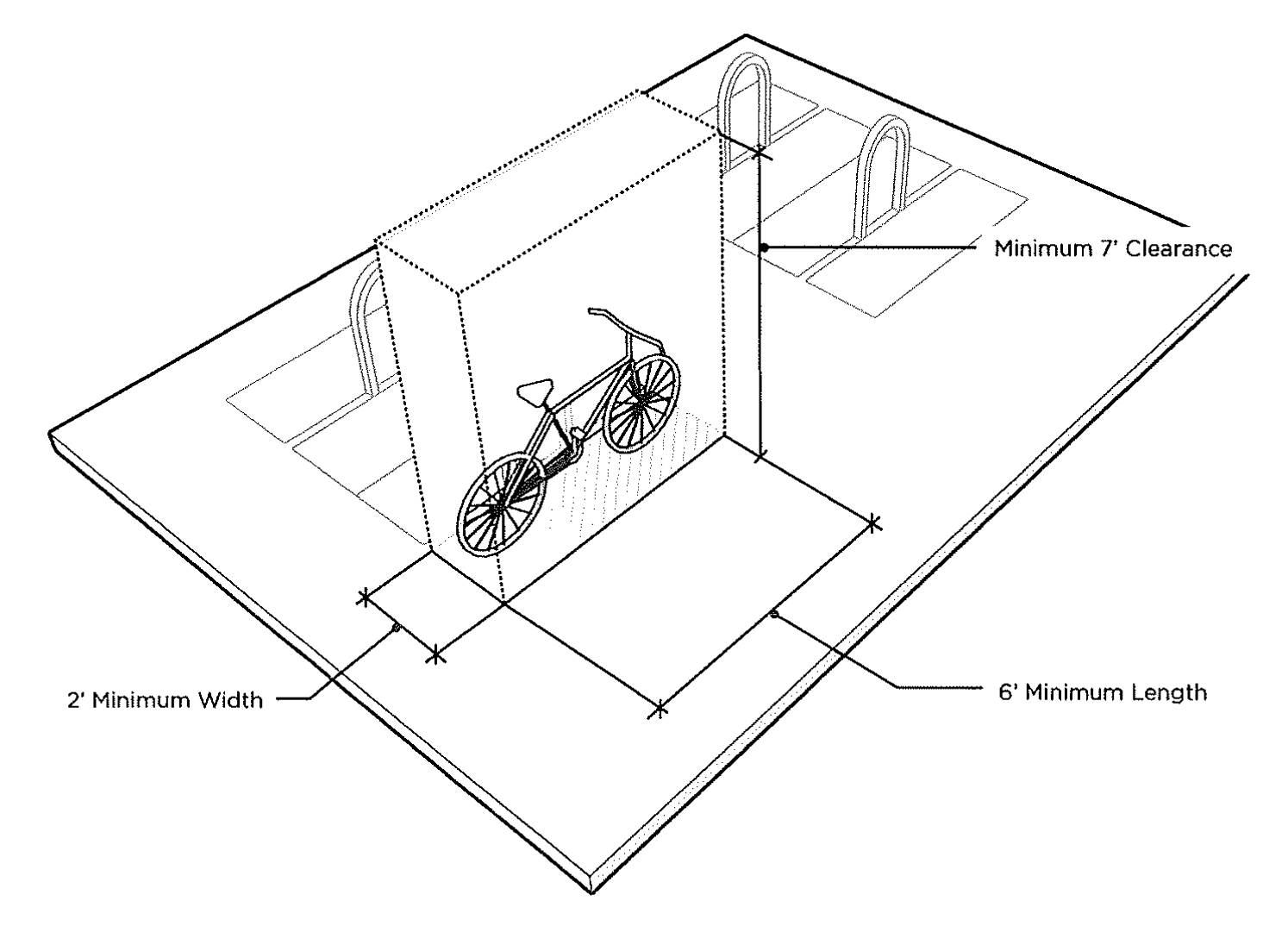 Required bicycle spaces must have a minimum dimension of two feet in width by six feet in length, with a minimum overhead vertical clearance of seven feet. Bicycle spaces are counted by the number of bicycles than can be stored on a rack, meeting these dimensions for a bicycle space.
