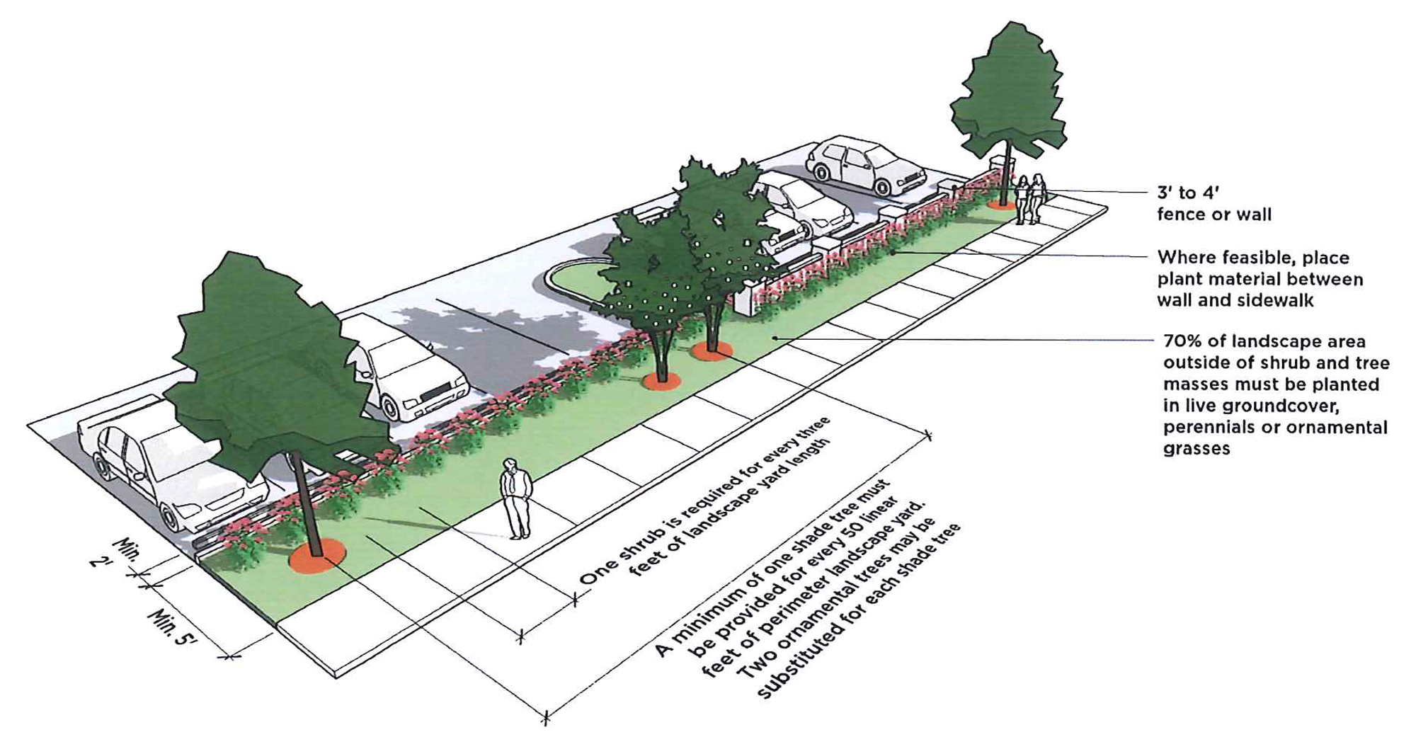 A perimeter landscape yard is required for all parking lots that abut a public right-of-way, excluding alleys, and must be established along the edge of the parking lot to screen the parking lot. The landscape treatment must run the full length of the parking lot perimeter along the right-of-way and must be located between the lot line and the edge of the parking lot. The landscaped area must be improved as follows: