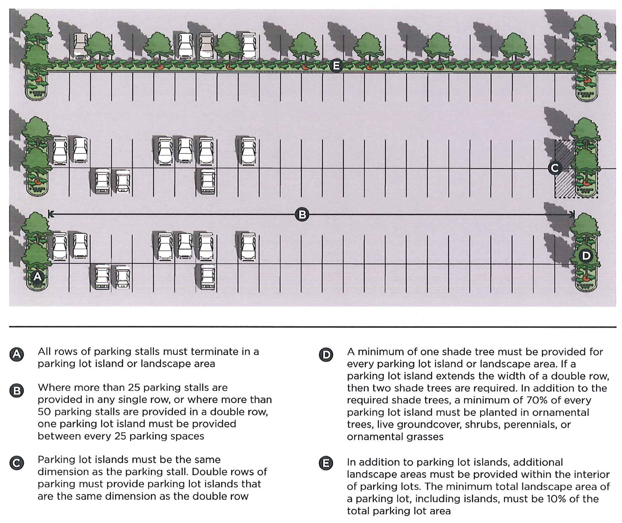 A minimum of one shade tree must be provided for every parking lot island or landscape area. If a parking lot island extends the width of a double row, then two shade trees are required. In addition to the required shade trees, a minimum of 70% of every parking lot island must be planted in ornamental trees, live groundcover, shrubs, perennials, or ornamental grasses.