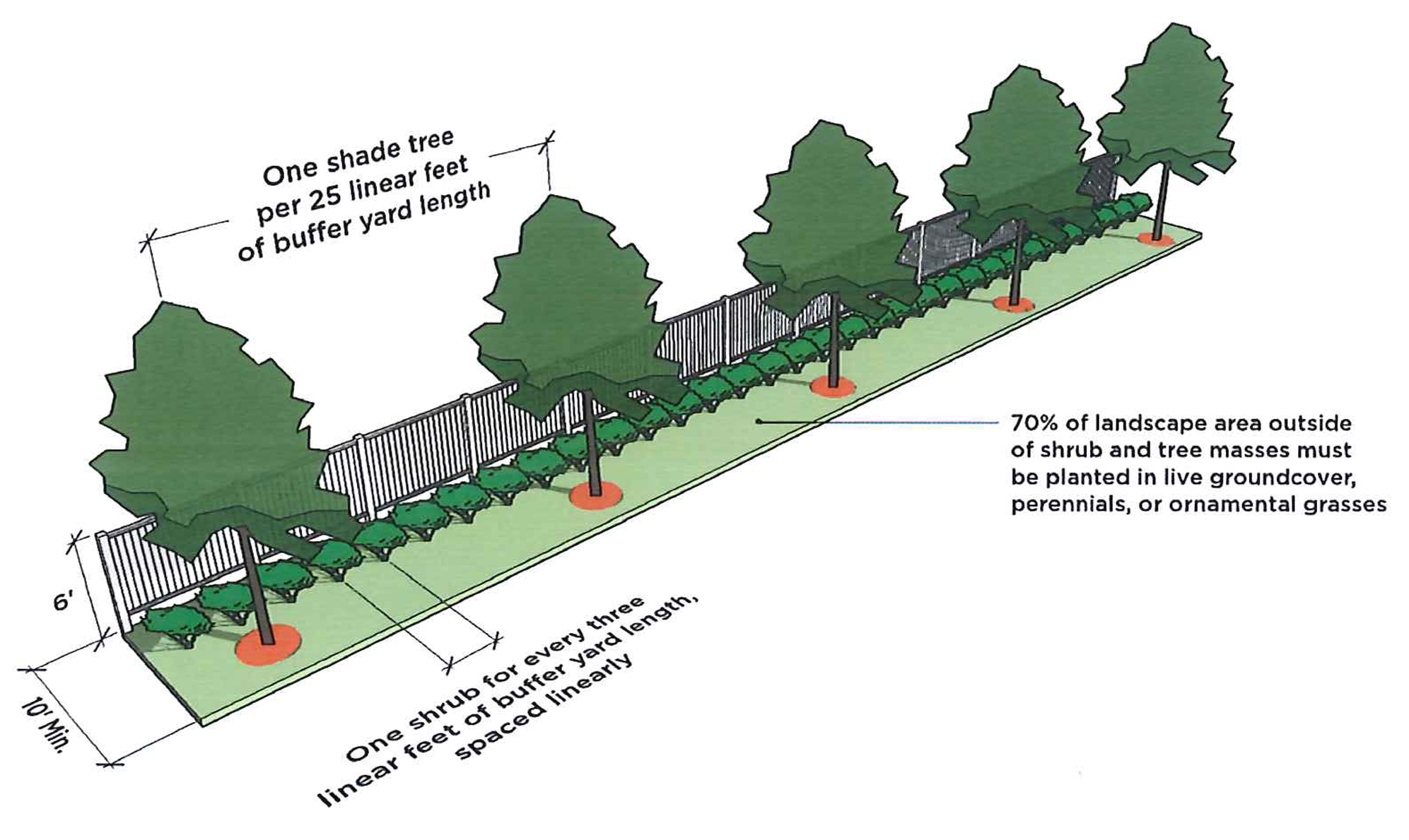 This section establishes standards for the dimension and required landscape for buffer yards between land uses and/or zoning districts within the rear or interior side yard. Nothing in this section prevents the applicant's voluntary installation of buffer yards where they are not required.