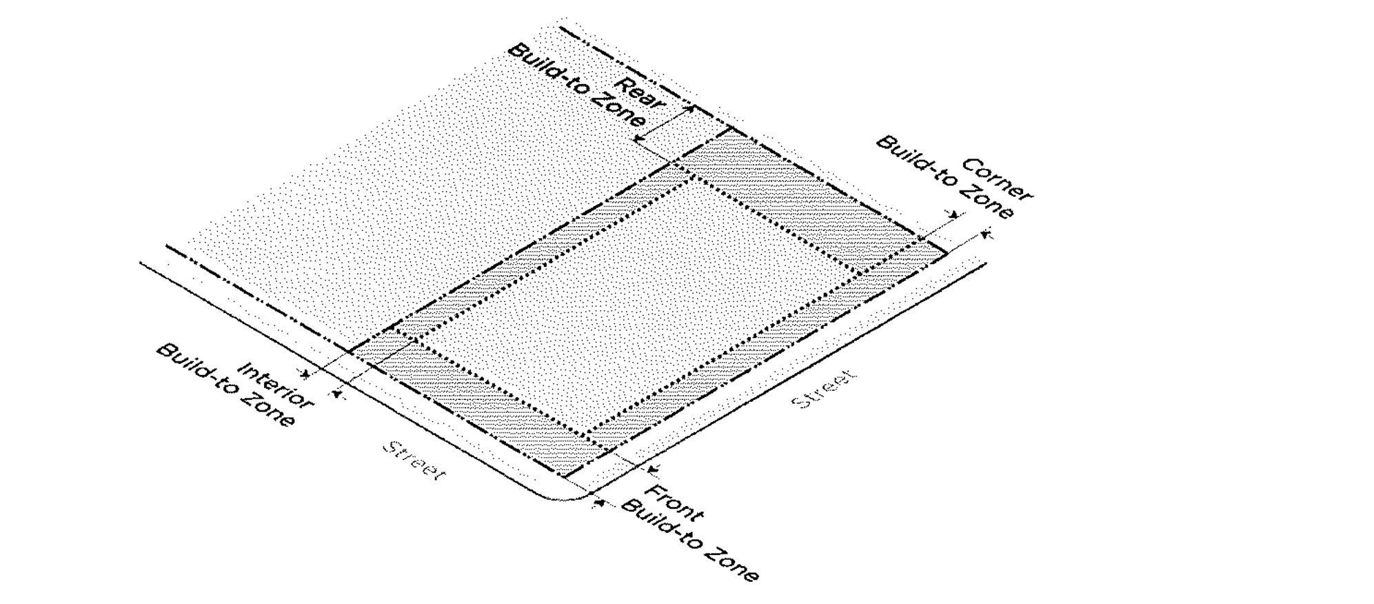 Build-To Zone (BTZ). A required setback where a certain percentage of building frontage must be located, measured as a minimum and maximum range from the applicable lot line.