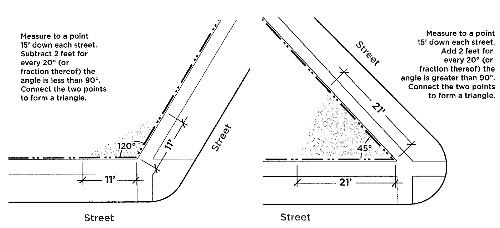 For intersections forming an angle greater than 90 degrees, 15 feet down each street measured along the right-of-way, minus two feet for each 20 degrees or fraction thereof the angle exceeds 90 degrees.