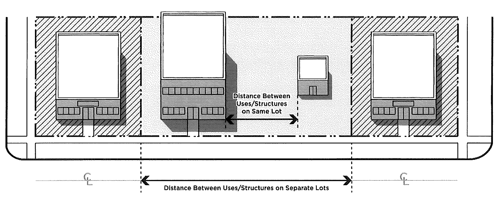 Separation/Required Distance Between. When the Ordinance requires separation between structures or uses located on separate lots, such separation is measured between the closest lot lines of the two lots. When the Ordinance requires separation between structures or uses located on the same lot, such separation is measured between building walls.