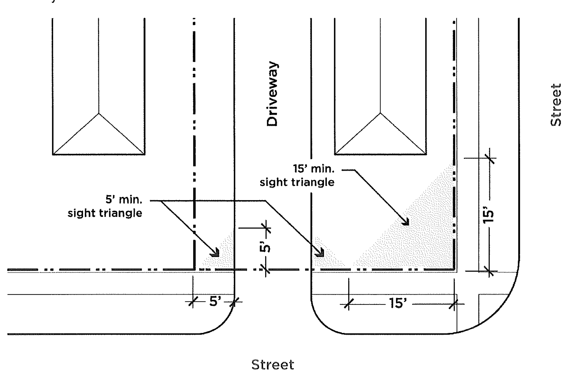 Sight Triangle. A sight triangle is located at the intersection of the street or alley right-of-way, access easement, and/or driveway pavement, is measured at a line joining the points at a distance as follows: