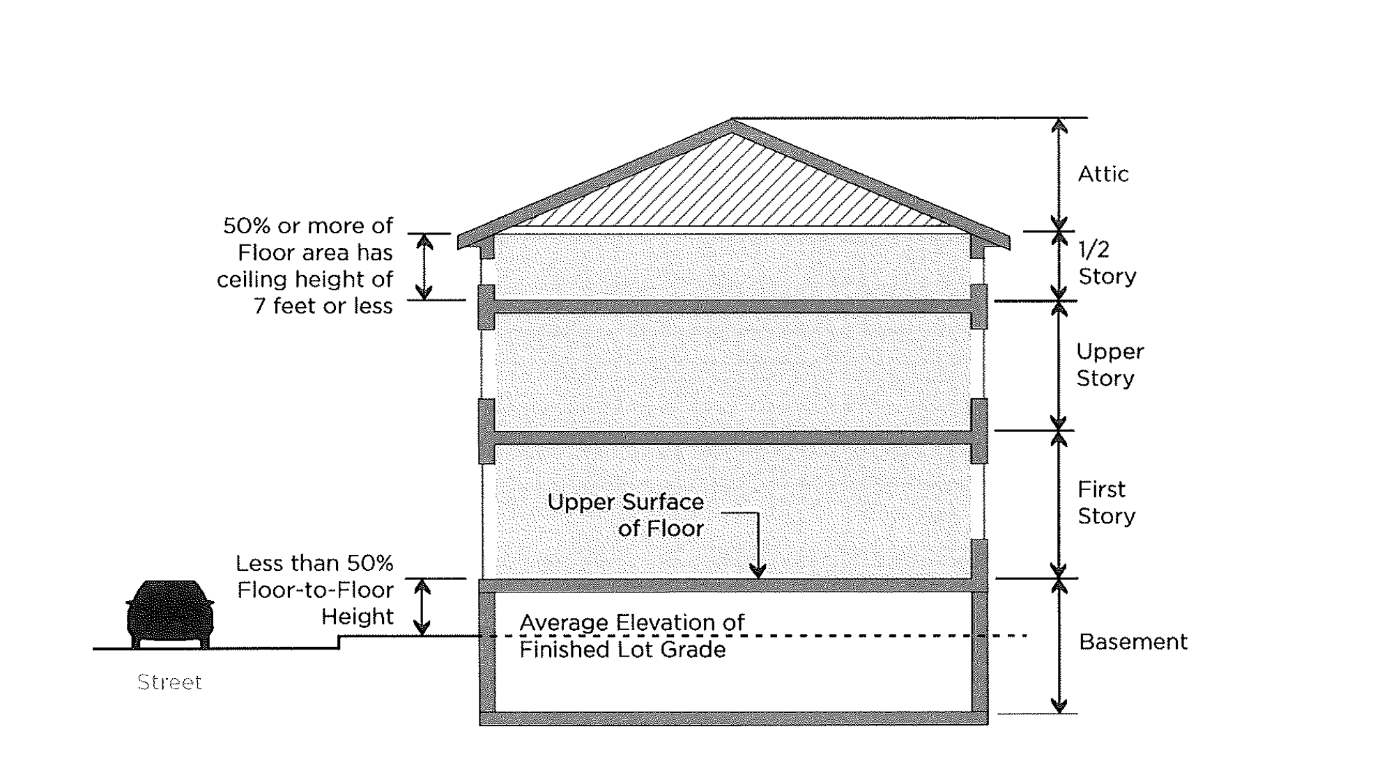A story is each level of a building included between the surface of any floor and the surface of the floor next above it, or if there is no floor above, then the space between the floor and the ceiling next above it. A half-story is the uppermost story or partial story of a structure where 50% or more of the floor area has a ceiling height of seven feet or less.