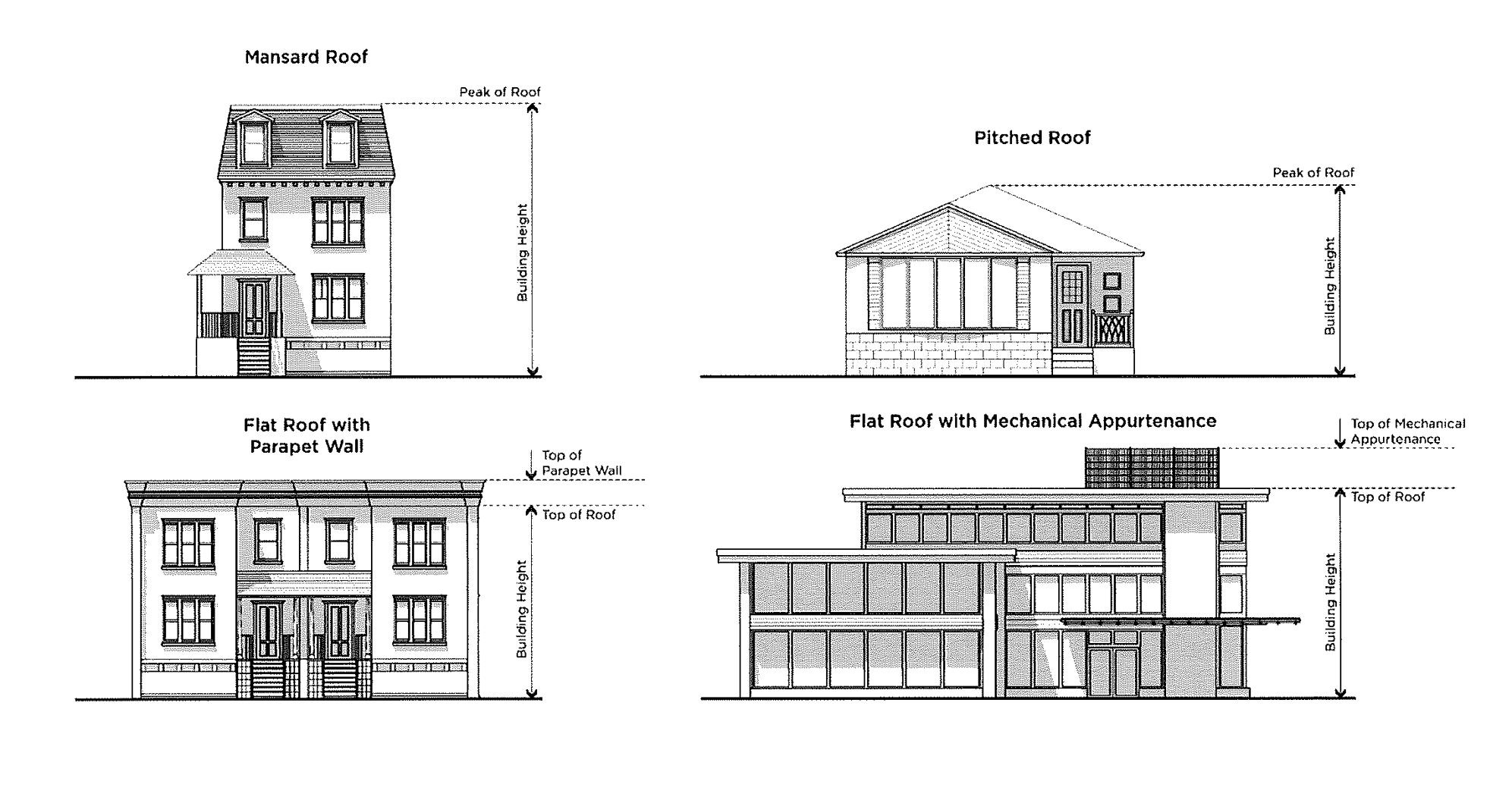 Building appurtenances such as chimneys, parapet walls, skylights, steeples, flag poles, smokestacks, cooling towers, elevator bulkheads, fire towers, monuments, water towers, stacks, stage towers, or scenery lofts, tanks, ornamental towers and spires, roof gardens, recreational facilities, necessary mechanical appurtenances, or penthouses to house mechanical appurtenances. However, if such appurtenances occupy more than 25% of the total roof area, they are counted toward building height.