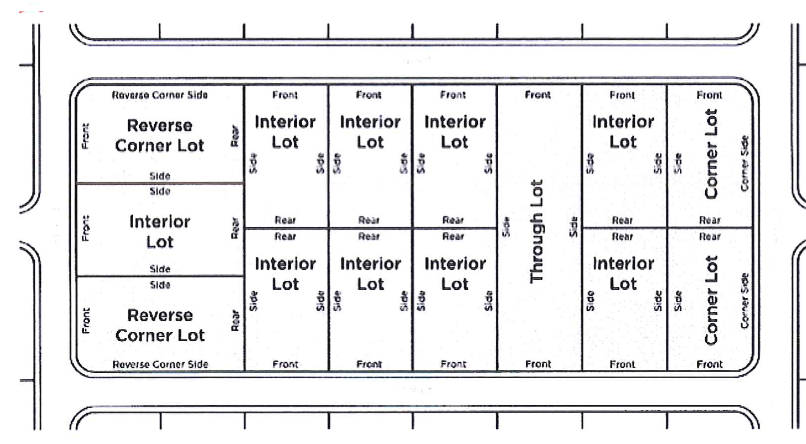 An interior lot is a lot other than a corner, reverse corner, or through lot, typically bounded by two interior side lot lines.