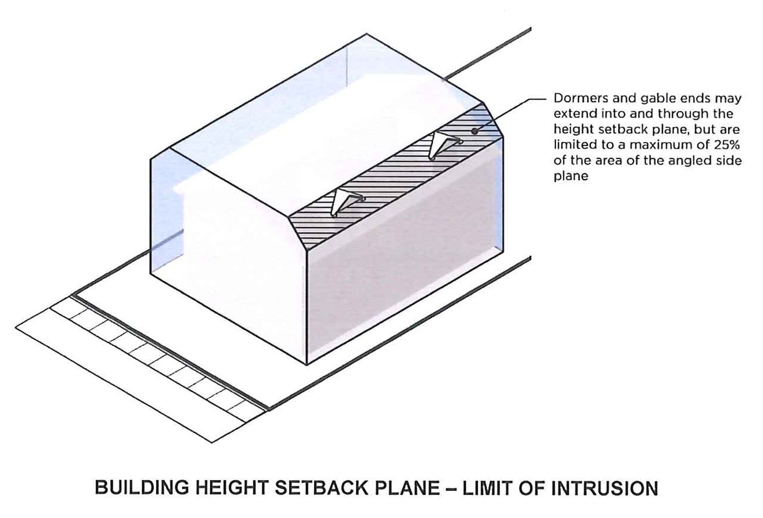 Dormers and gable ends may extend into and through the height setback plane, but are limited to a maximum of 25% of the area of the angled side plane. Dormers and gable ends must comply with the building height restrictions of this Ordinance.