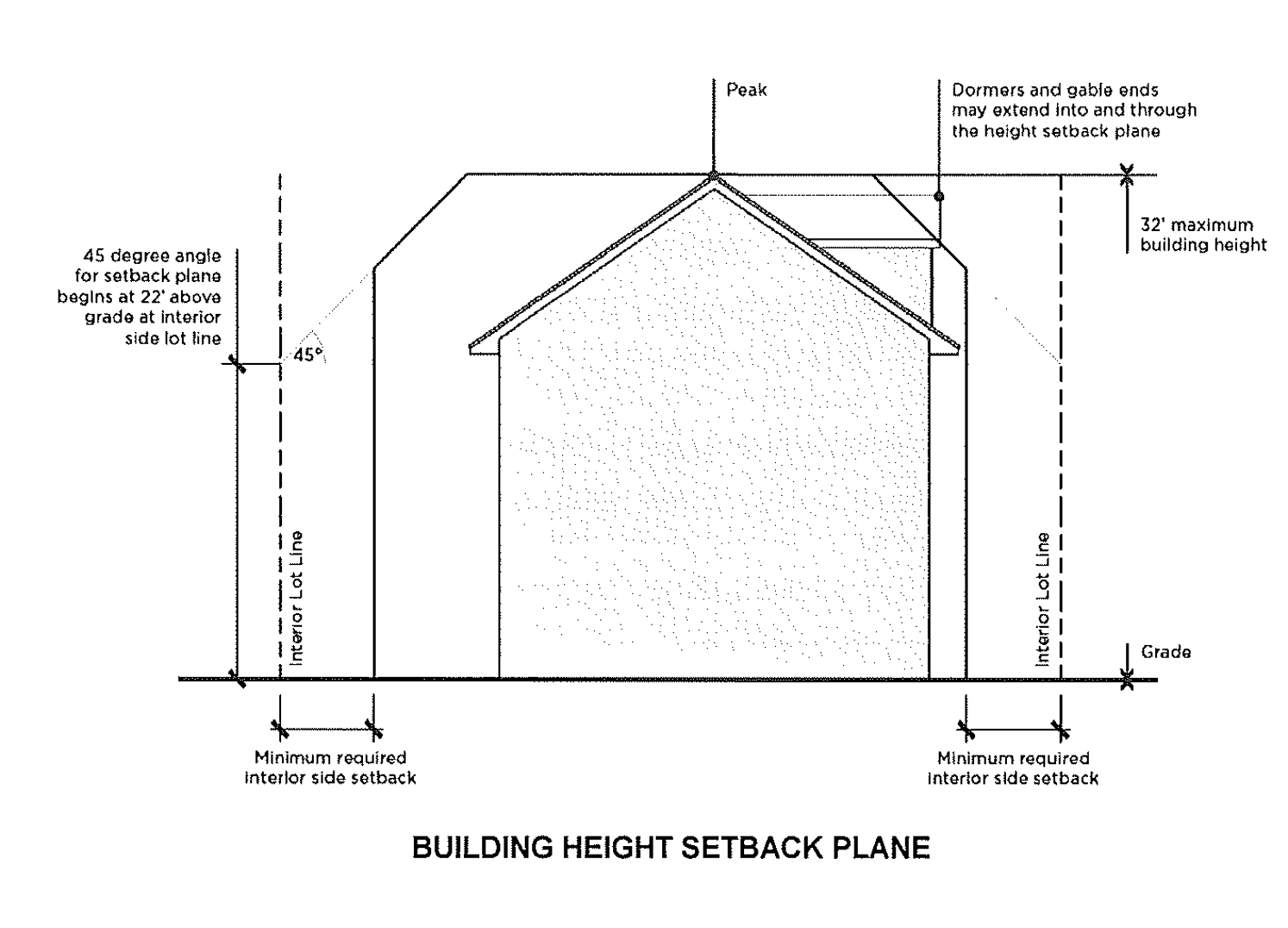 No portion of a structure may intersect the planes that begin at a point 22 feet above grade at the interior side lot line and run at a 45° angle toward the interior of the lot until they reach the maximum building height permitted.