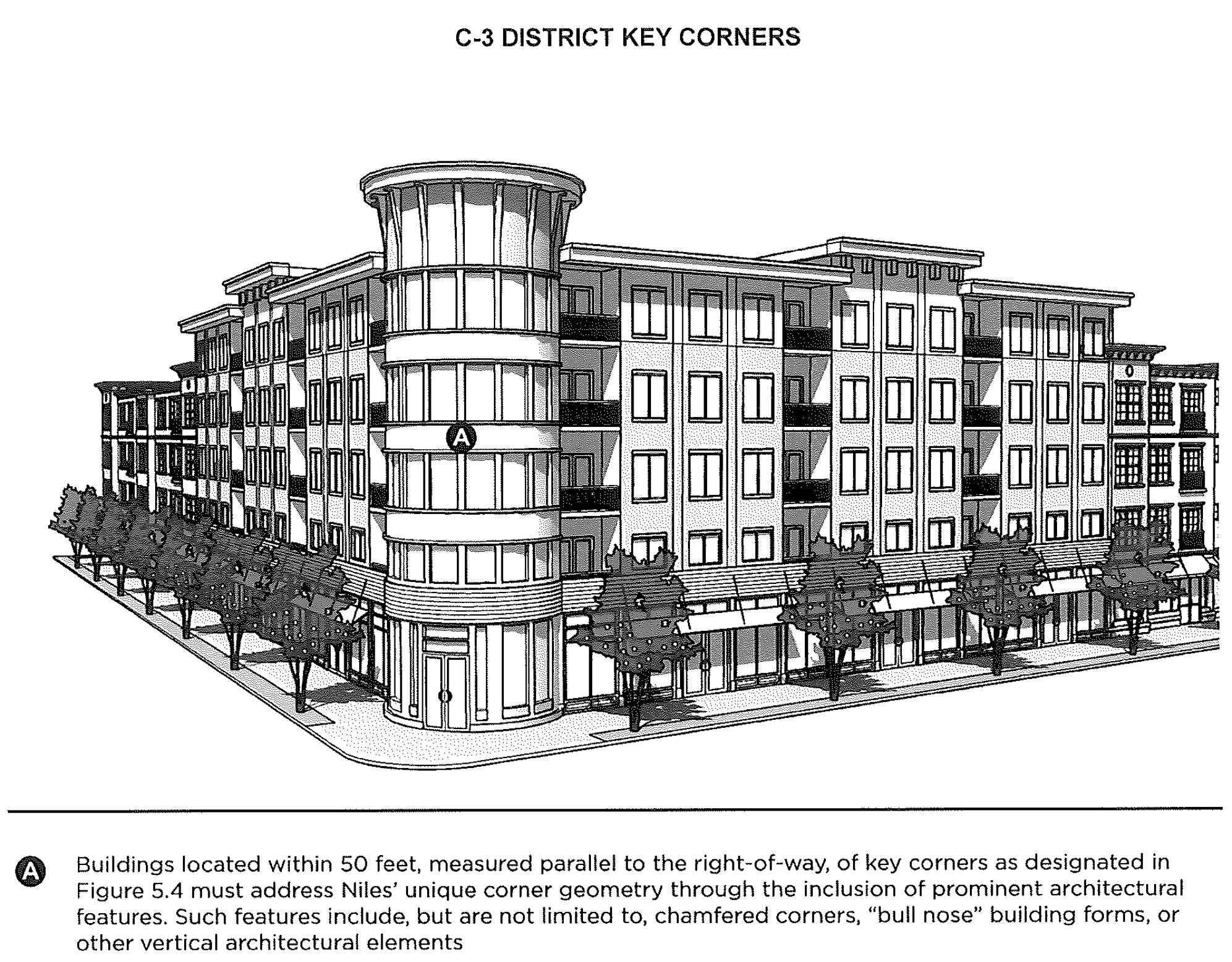 Buildings located within 50 feet of key corners as designated in Figure 5.4, measured parallel to the right-of-way, must address Niles' unique corner geometry through the inclusion of prominent architectural features. Such features include, but are not limited to, chamfered corners, "bull nose" building forms, or other vertical architectural elements.