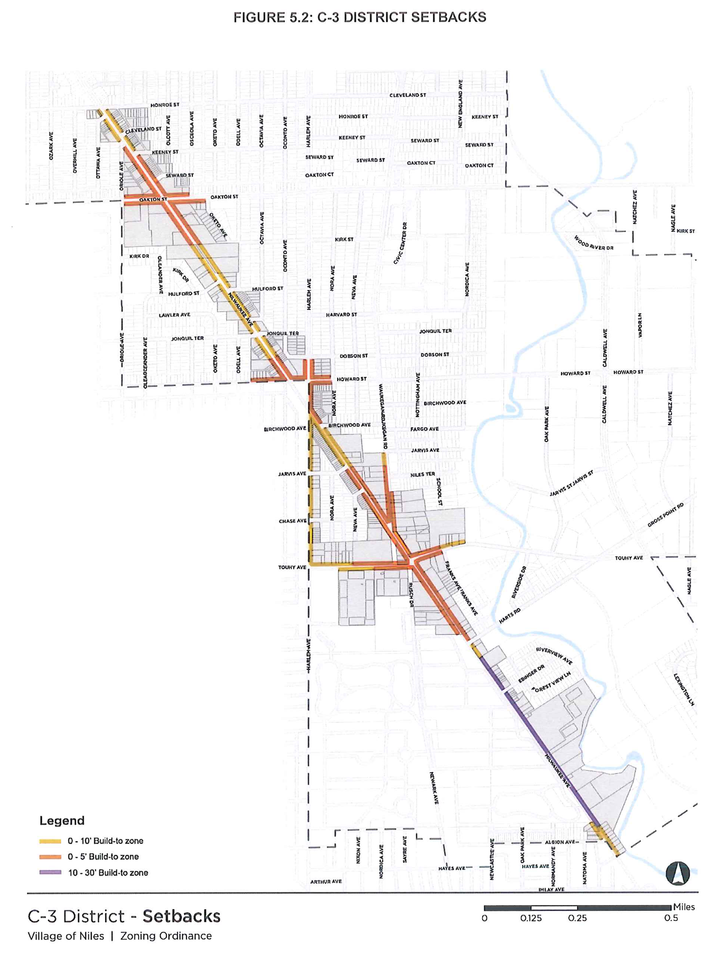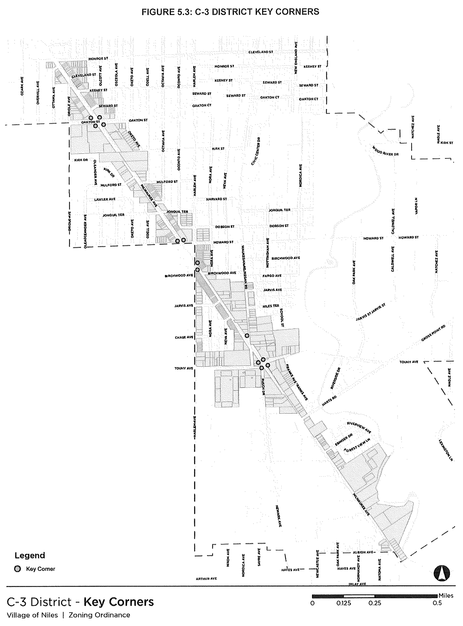 Buildings fronting on Milwaukee Avenue, Oakton Street, Howard Street, and Touhy Avenue must locate 80% of the length of any façade abutting those streets within the required build-to zone. Buildings located at a key corner as designated in Figure 5.4 must locate the first 50 feet from the corner on any façade abutting a street within the required build-to zone.