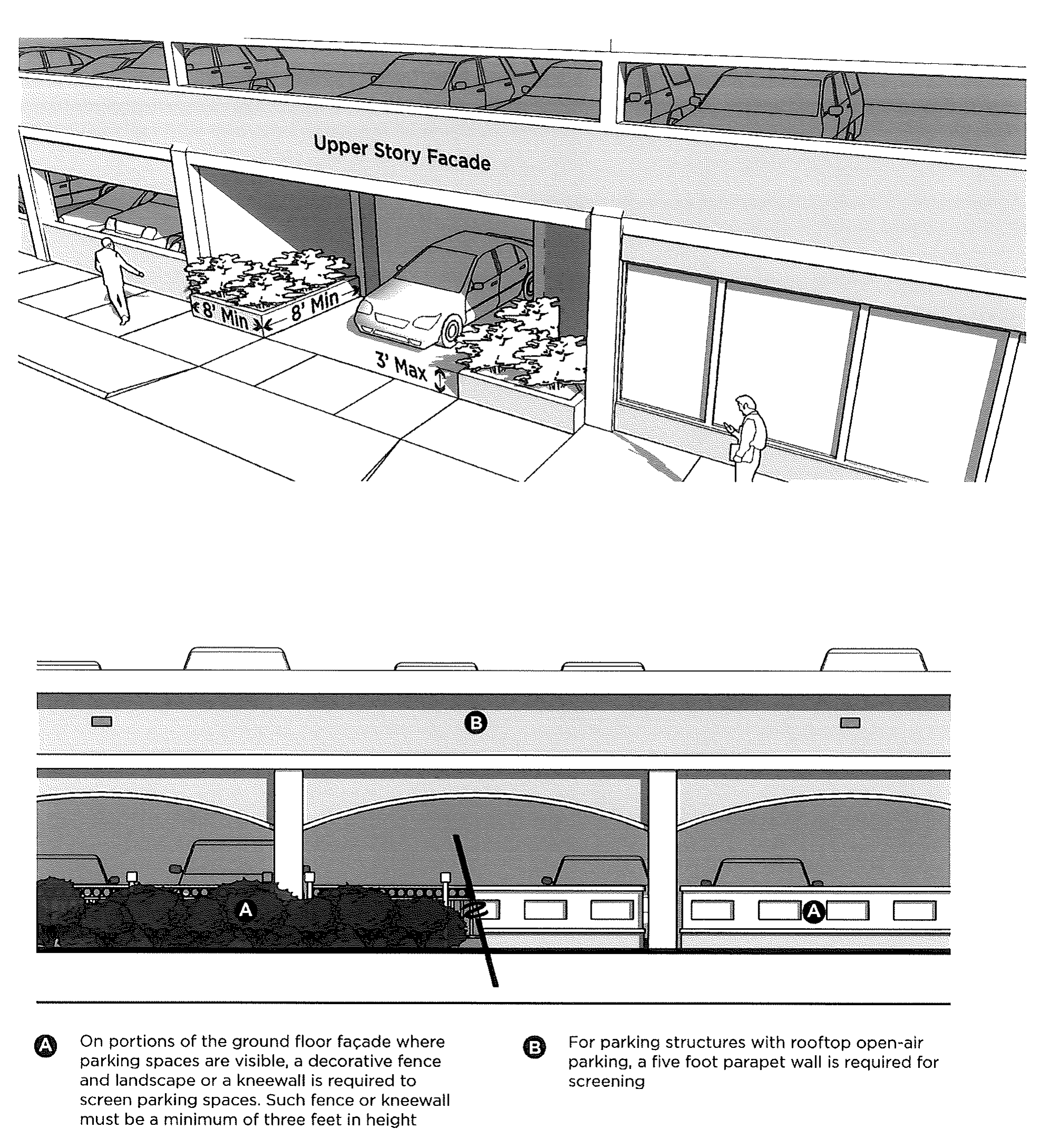 A permanent safety barrier must be erected to maintain a separation between the outdoor sales areas and any parking and drive-aisles.