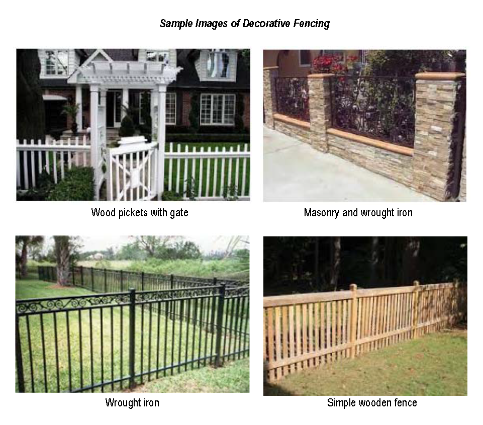 Any wall or fence which extends into the front yard, where allowed, on property containing less than three acres shall be ornamental or decorative and may be constructed of brick, stone, wood, stucco, wrought iron or split rail; provided that no wall or fence shall be constructed of exposed concrete block, tires, junk or other discarded materials. Any front yard fence or hedge row, where allowed, shall be setback a minimum of three feet from the edge of the right of way.