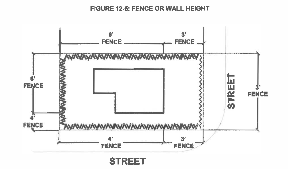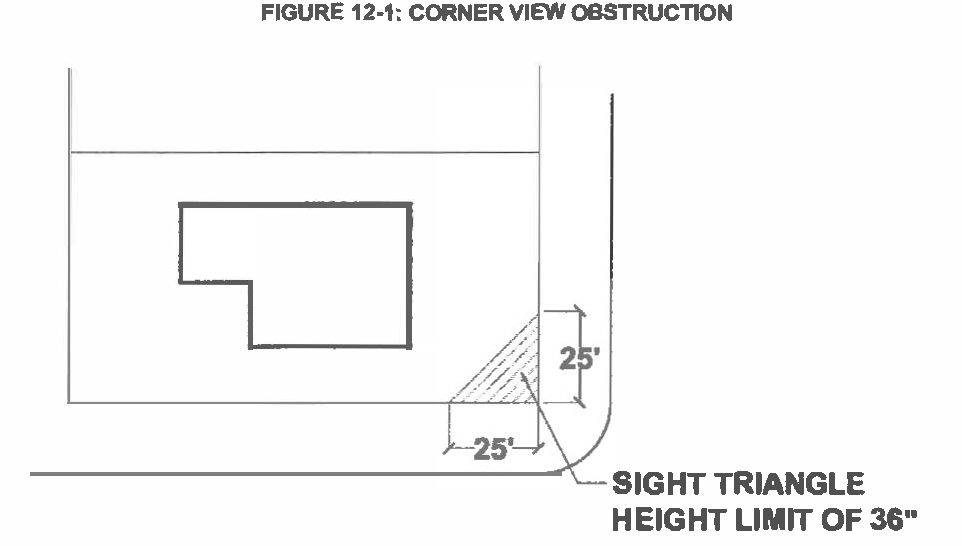 Notwithstanding any provisions relating to building height as provided in this ordinance, the visional clearance area at the intersection of two streets, which shall be defined as a triangular area of a corner lot measured twenty-five (25) feet on the front lot line and twenty-five (25) feet on the corner side lot line, and shall not be obstructed by any sign, wall, fence, hedge, shrub or other object which exceeds thirty-six (36) inches in height. In the event that the grade of a lot is higher than the street grade, the height of the wall, fence, hedge, or shrub shall be reduced so that the visional clearance is not obstructed thirty-six (36) inches over the grade of the street. The vision clearance area is illustrated in Figure 12-1: Corner View Obstruction.