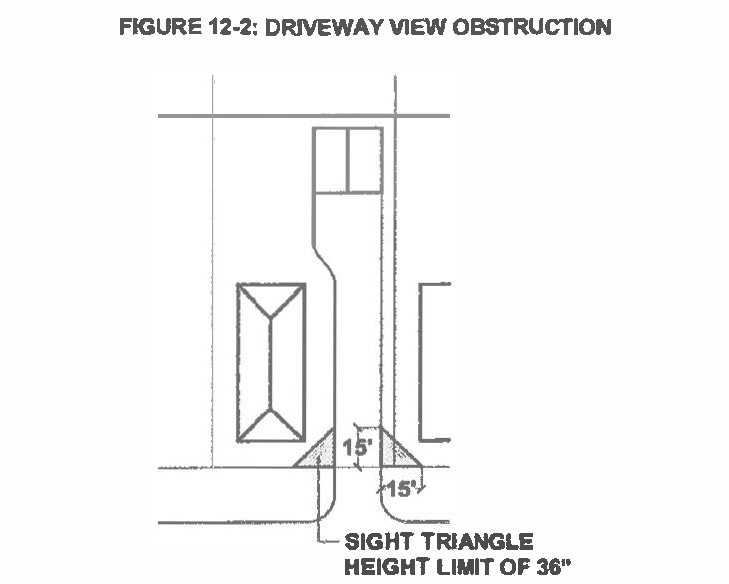 Notwithstanding any provisions relating to building height as provided in this ordinance, the vision clearance area at the intersection of a driveway and a street, which shall be defined as a triangular area measured fifteen (15) feet on the lot line on either side of the driveway, and shall not be obstructed by any sign, wall, fence, hedge, shrub or other object which exceeds thirty-six (36) inches in height. In the event that the grade of a lot is higher than the street grade, the height of the wall, fence, hedge, or shrub shall be reduced so that the visional clearance is not obstructed thirty-six (36) inches over the grade of the street. The vision clearance area is illustrated in Figure 12-2: Driveway View Obstruction.