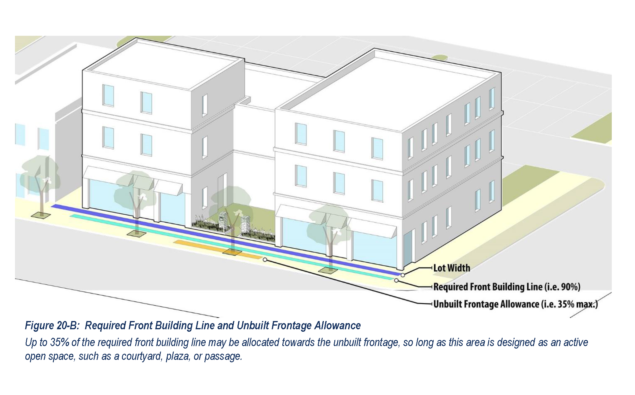 Unbuilt Frontage Allowance. Where buildings are arranged around or enter upon active open spaces at the extension of the public streetscape, this open space can satisfy a portion of the required front building line to the extent specified in Table 20-2 (Unbuilt Frontage Allowance), provided the open space is designed as active open space according to the types specified in Section 17.24.030, and the open space includes some defining features at the extension of the required front building line such as decorative walls or fences, landscape features and other human scale details.