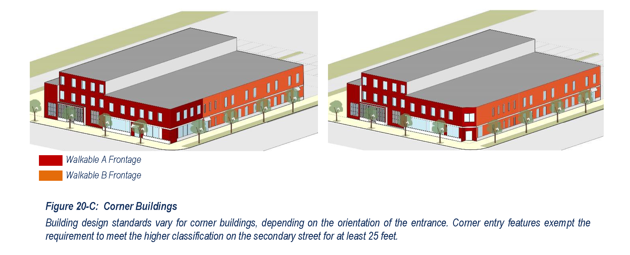 The building shall meet the higher classification on the secondary street for at least the first twenty-five (25) feet from the corner on the secondary frontage.