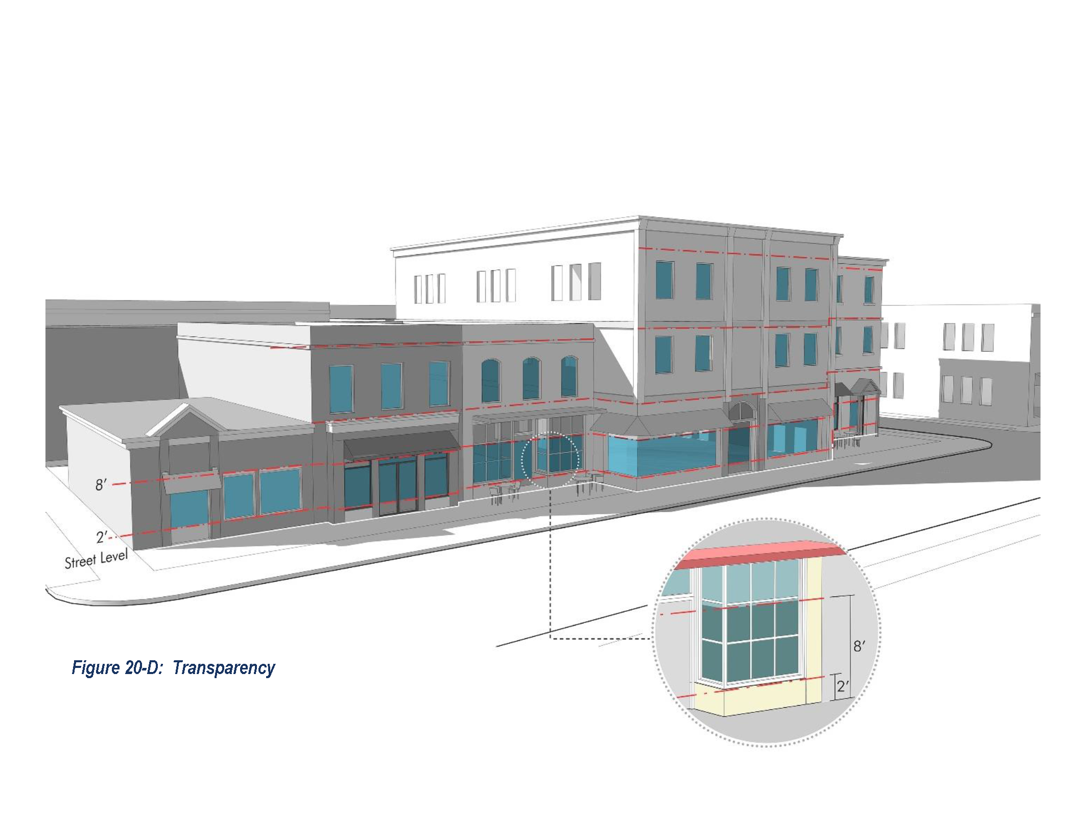Transparency. Buildings shall have the percentage of openings on street-facing façades specified in Table 20-2 (Street Level and Upper Level Transparency), based on the following: