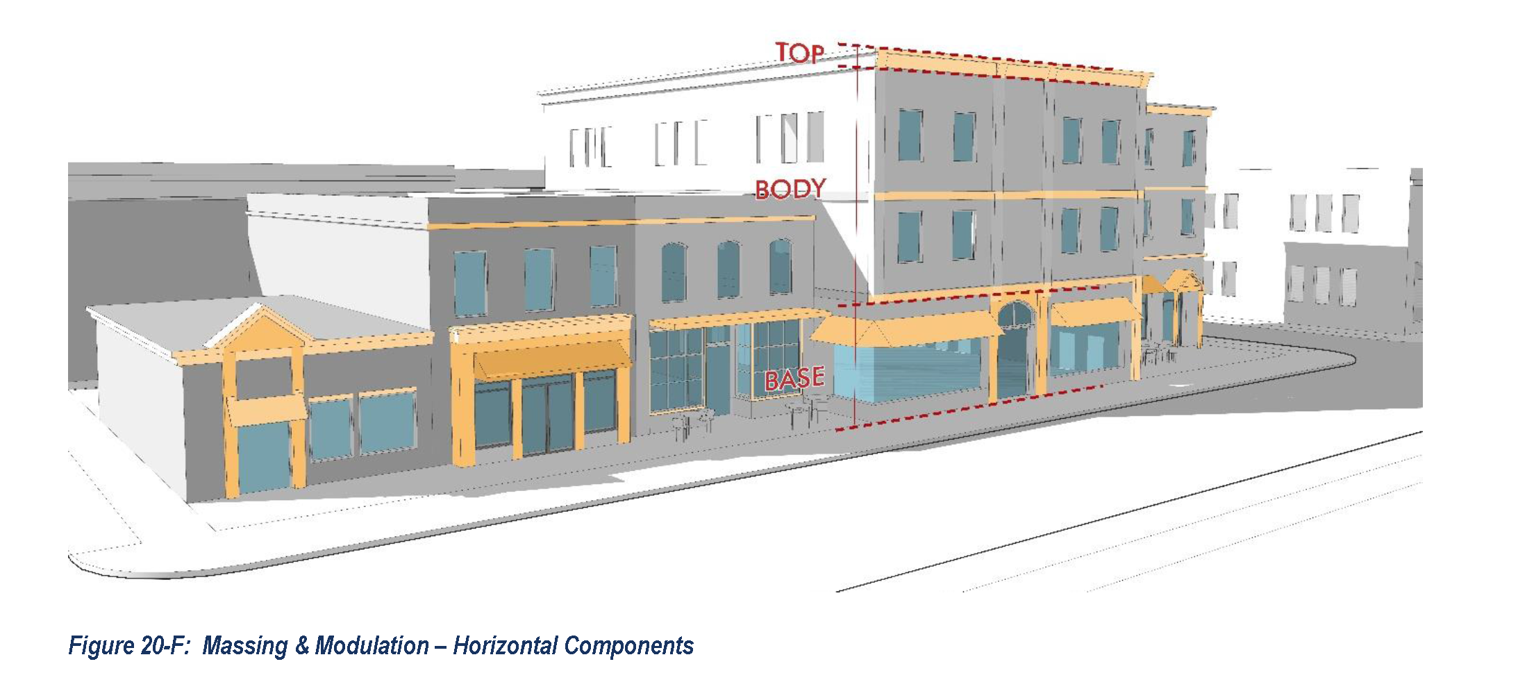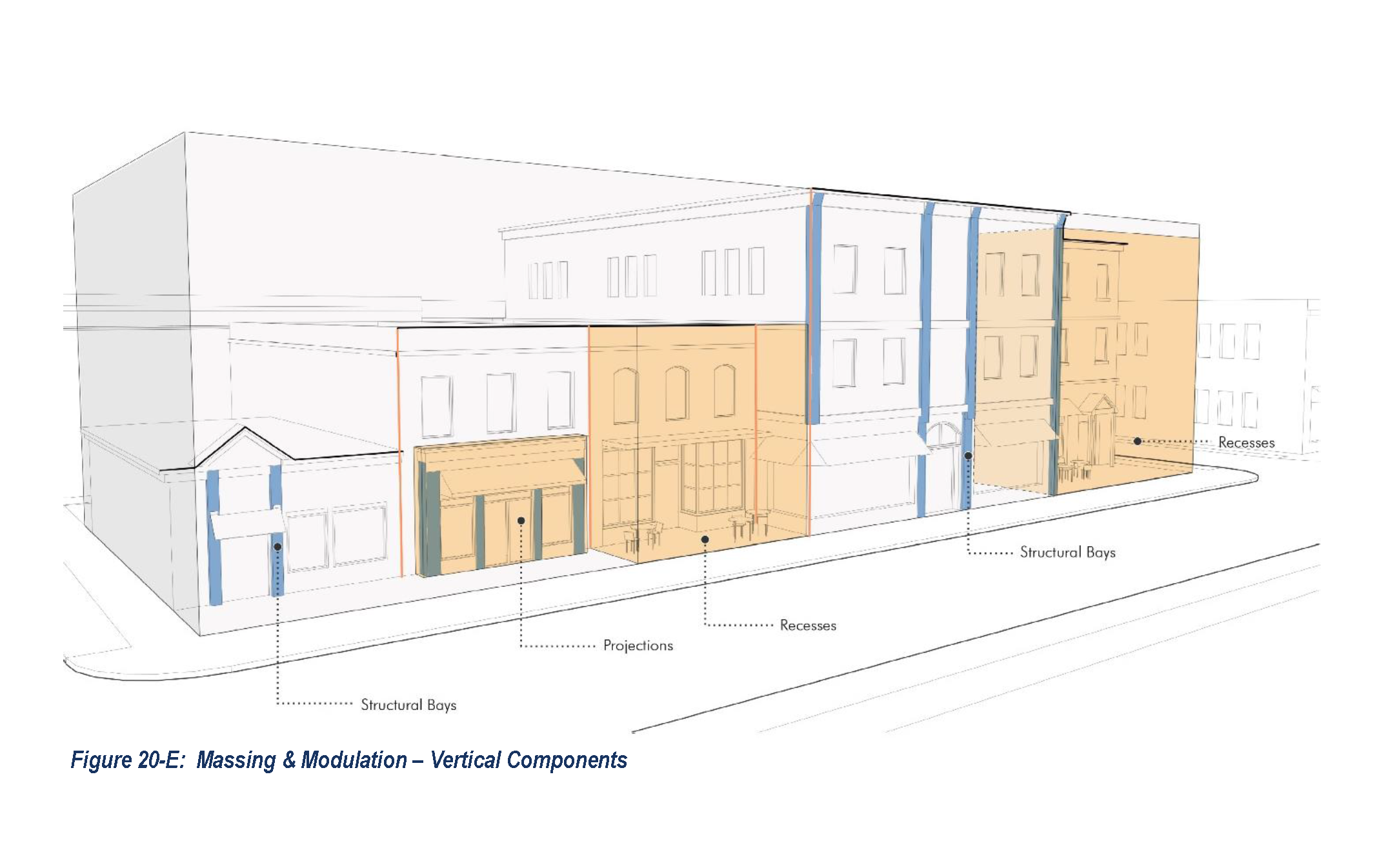 Massing and Modulation. Larger façades shall be broken into smaller components by one or a combination of the following techniques at intervals specified in Table 20-2 (Massing and Modulation):