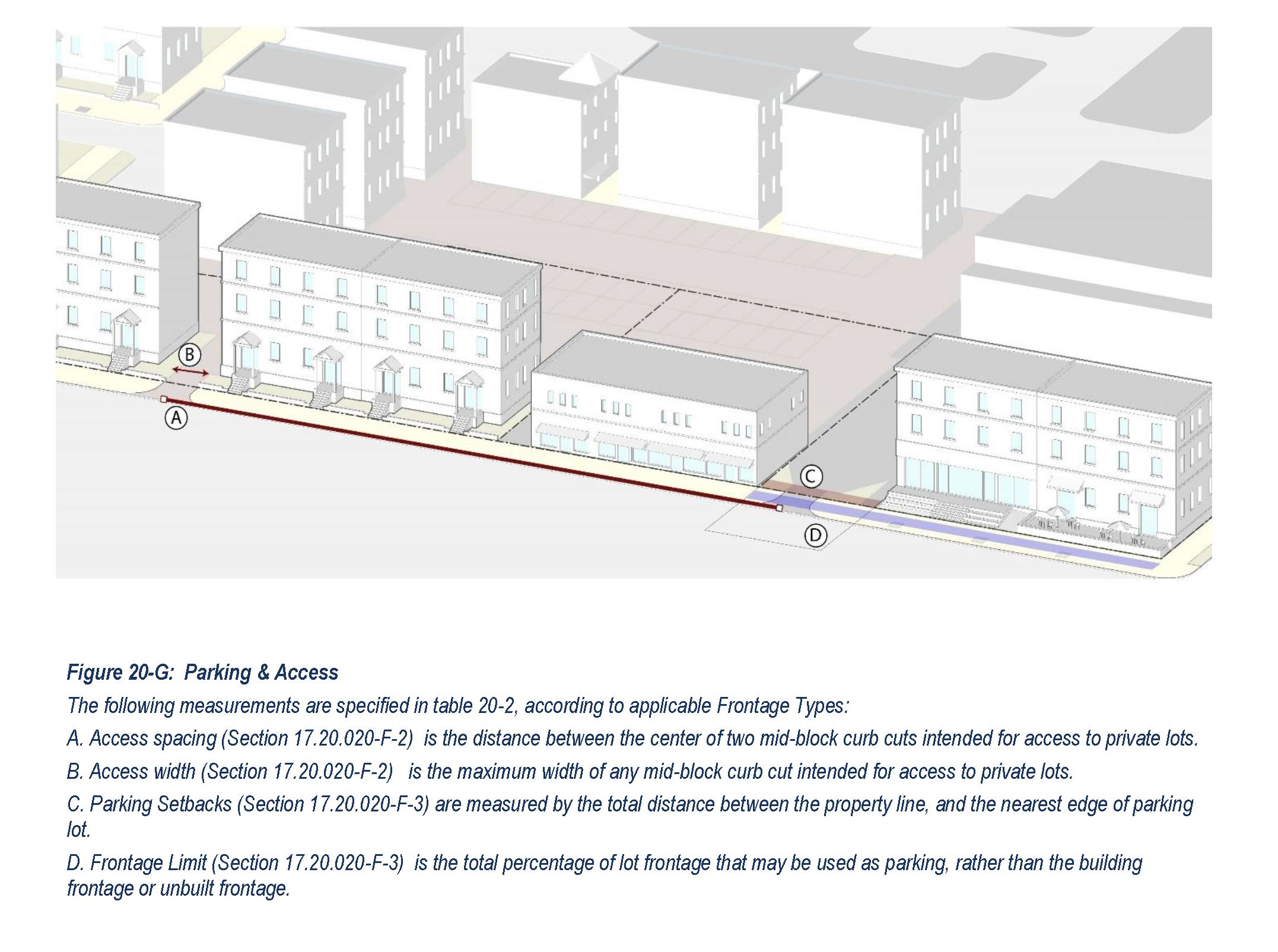 Access Limits. Private access to individual lots shall be limited by the separation distances specified in Table 20-2, measured on center, and limited to the maximum widths specified in the table. In cases where access is prohibited by these standards the rear or mid-block alleys, access from side streets, or through access shared by two or more lots along the block shall be used.