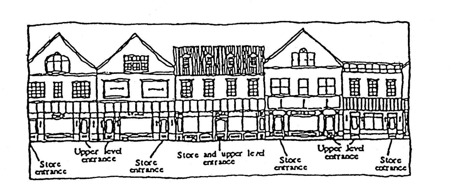 Mixed-use buildings. In mixed-use buildings, the difference between ground floor commercial uses and entrances for upper level commercial or residential uses shall be reflected by distinct but compatible differences in façade treatment. Storefronts are a necessary part of a mixed-use building and shall be integrated in design with the upper floors to be compatible with the building's overall façade character.