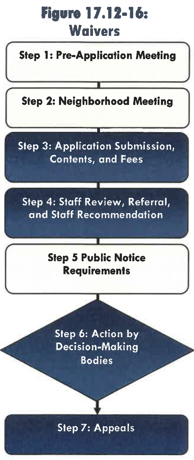 Procedures. Figure 17.12-16 shows the steps of the common development review procedures that apply in the review of applications for waivers. The common procedures are described in Section 17.12.040. Specific additions and modifications to the common review procedures are identified below.