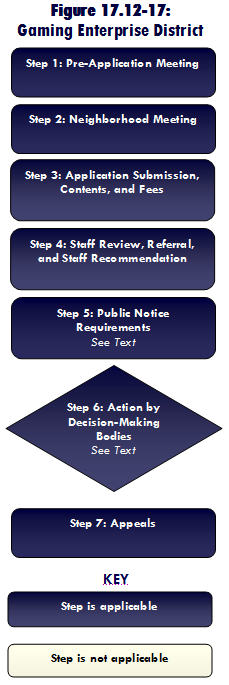 Procedures. Figure 17.12-17 shows the steps of the common development review procedures that apply in the review of applications for gaming enterprise districts. The common procedures are described in Section 17.12.040. Specific additions and modifications to the common review procedures are identified below.