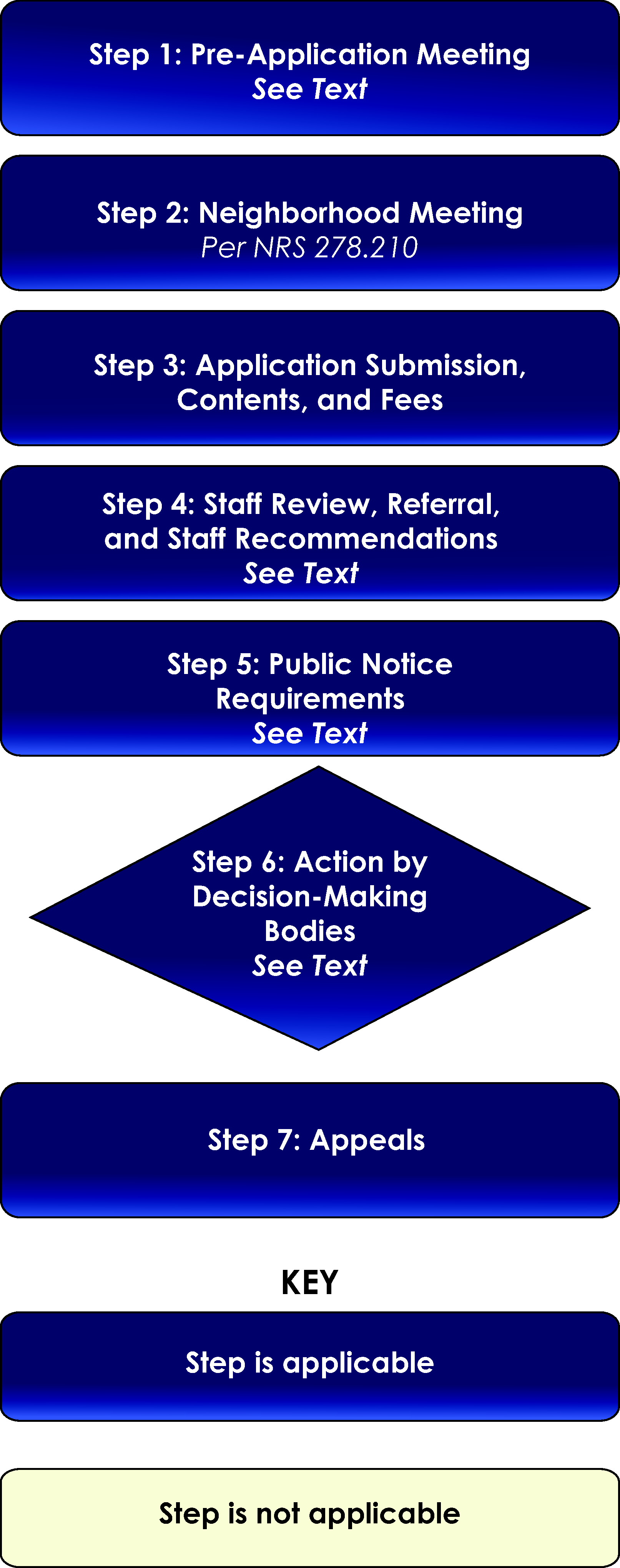 Step 5: Public Notice Requirements. Applications for development approval shall comply with the Nevada Revised Statutes (NRS) and the provisions of this chapter with regard to public notification.