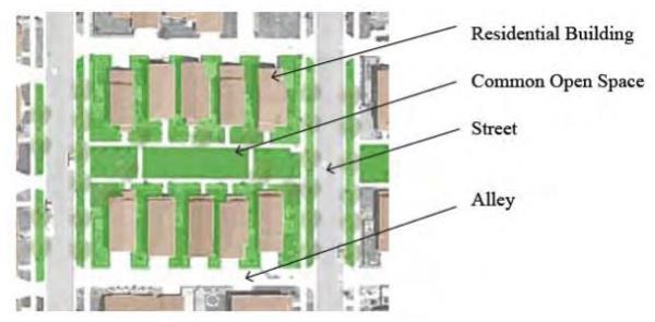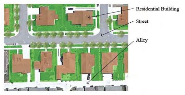 Garage Parking Configurations shall have the Parking structure located only in the rear of the lot. The various standard garage configurations are as follows. If an alley is present, access to the covered Parking / Garage structure must be from the alley.
