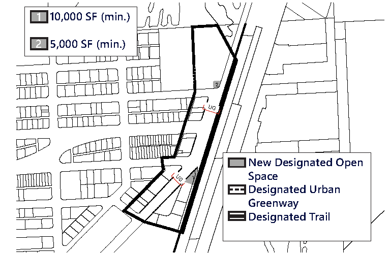 So long as publicly designated open space size and general proportion is provided as indicated in the regulating plan (Figure MU/IB-4), the precise location of the public open space may be shifted/rotated to provide flexibility for specific design concept.