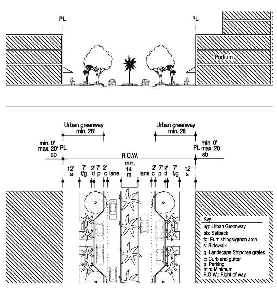 The total width of the urban greenway shall be no less than fourteen (14) feet and be measured from the back of curb (including existing sidewalk), to the facade of the building.