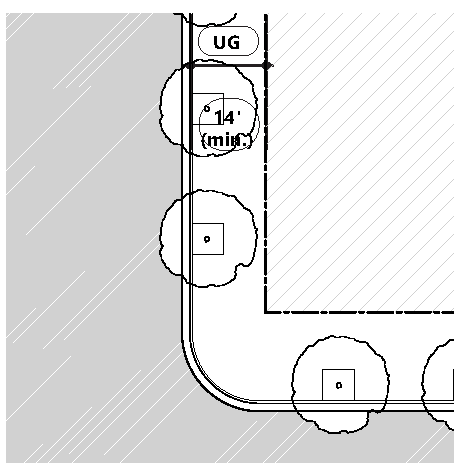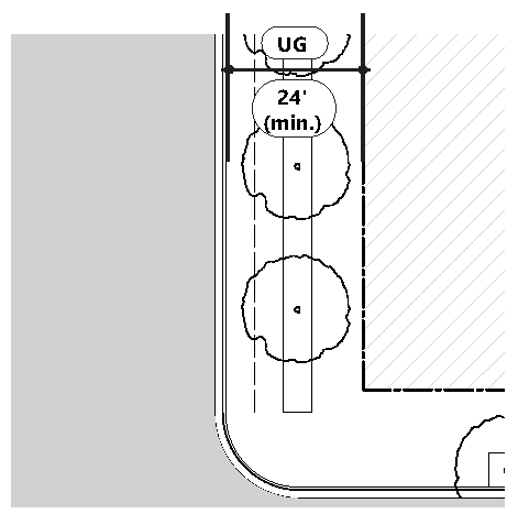 The total width of the UG-2 shall be no less than fourteen (24) feet and be measured from the back of curb (including existing sidewalk), to the facade of the building.
