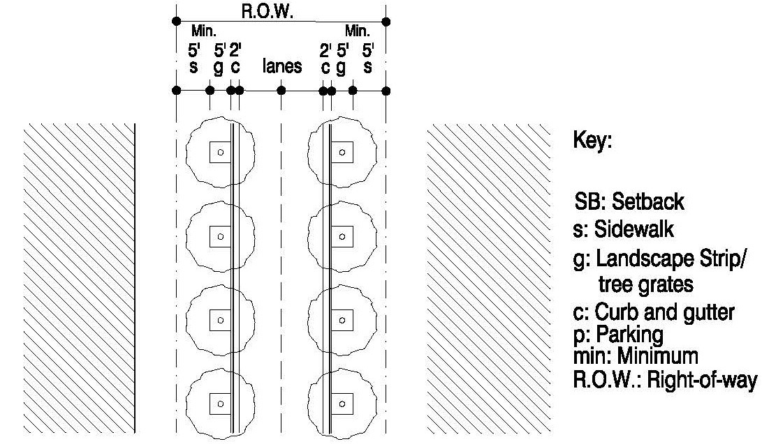 A minimum six (6) feet of sidewalk shall be added parallel to the ROW line and abutting the existing sidewalk, to equal a total width of fourteen (14) feet of sidewalk, measured from the back of curb along the corridor.
