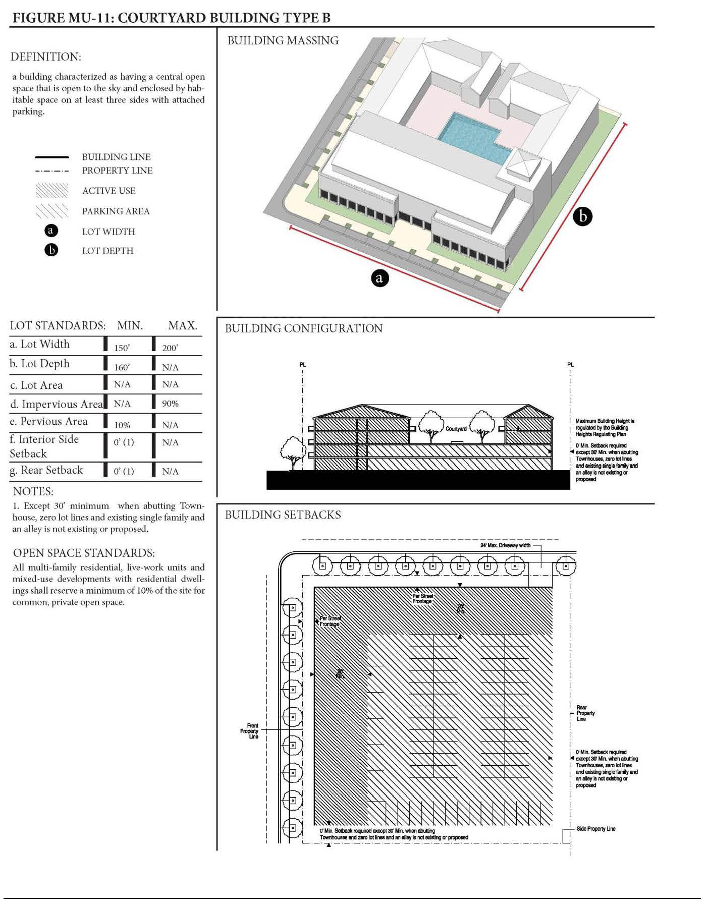 Setbacks and Building Frontage. Front and Side setbacks are determined based on the street that the building fronts. Table MU/IB-5 lists the setbacks and building frontage occupation required for each street type within the MU/IB. The interior and rear setbacks, as well as the lot standards shall be as specified per building type in Section 24-58 Mixed-Use District.