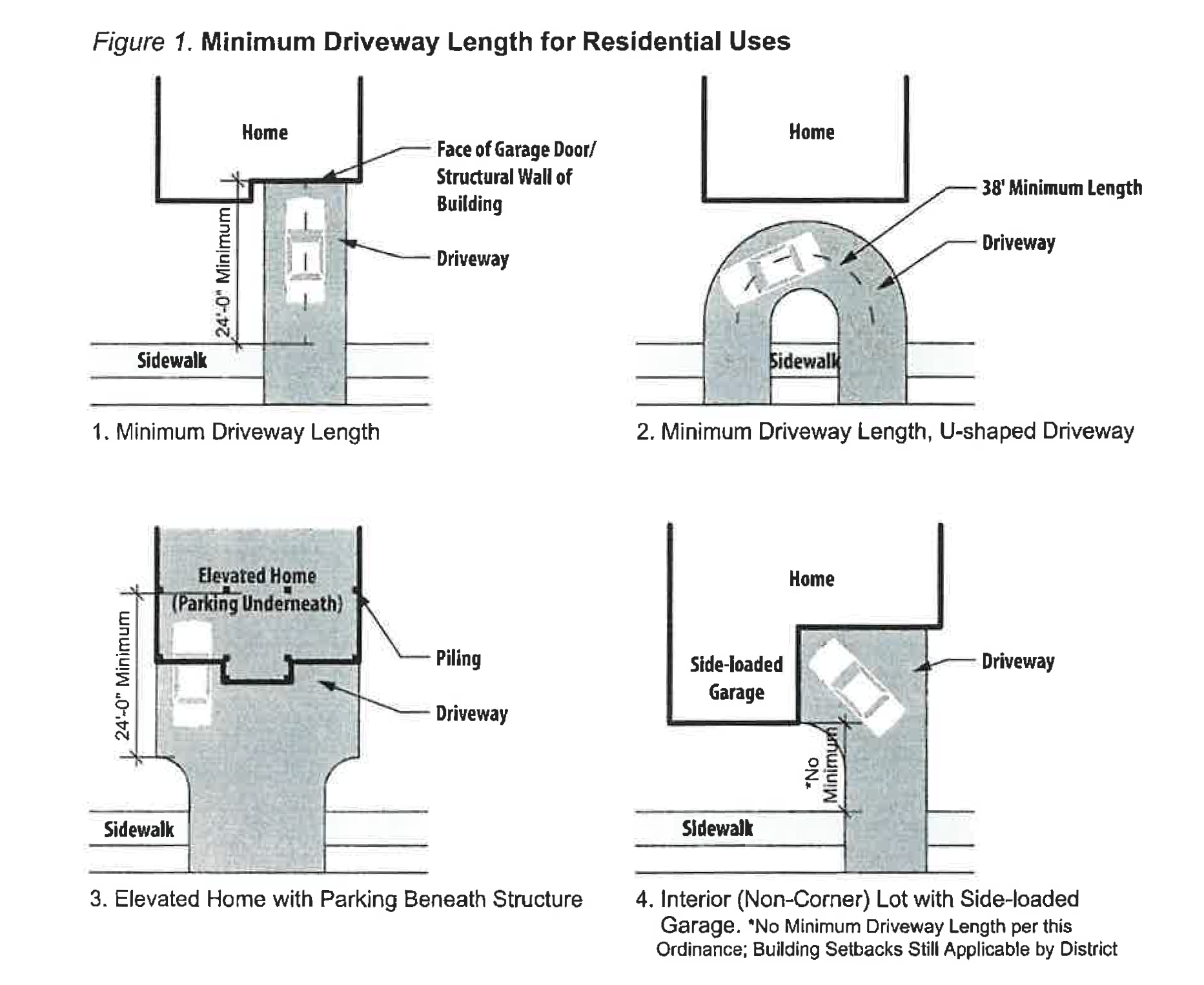 To minimize vehicles overhanging sidewalks or pedestrian paths, the following shall apply for residential units with driveways: