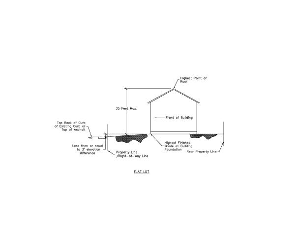 The height of a building on a flat lot is measured from the highest finished grade at the building foundation to the highest point of the roof, which can be no higher than thirty-five feet (35’). The definition of a "flat lot" is no more than three feet (3') of difference from the lowest point of the top back of curb to the highest point of the top back of curb on the building lot.