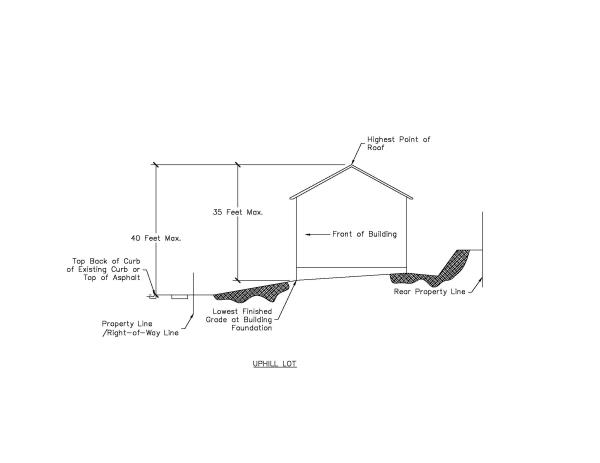 The height of a building on an uphill lot is measured from the lowest finished grade of the building foundation to the highest point of the roof, which can be no higher than thirty-five feet (35’). Also, the height of the building from the top back of curb at the center of the lot to the highest point of the roof can be no higher than forty feet (40’)..