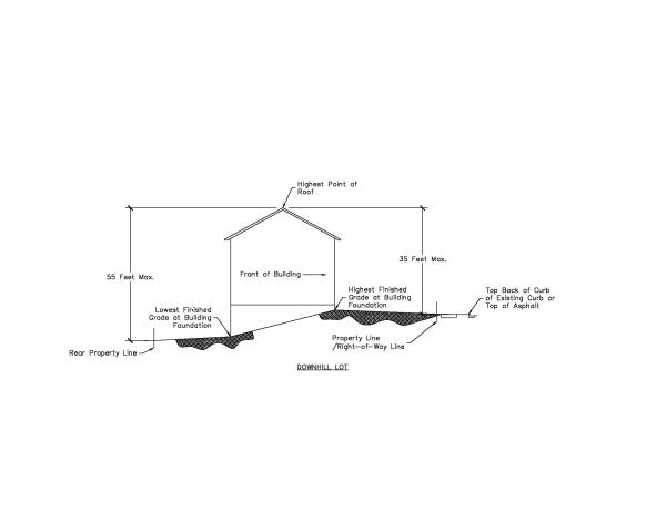 The height of a building on a downhill lot is measured from the highest finished grade at the building foundation to the highest point of the roof, which can be no higher than thirty-five feet (35’). Also, the height of a building from the lowest grade of the foundation to the highest point of the roof can be no higher than fifty five feet (55’).